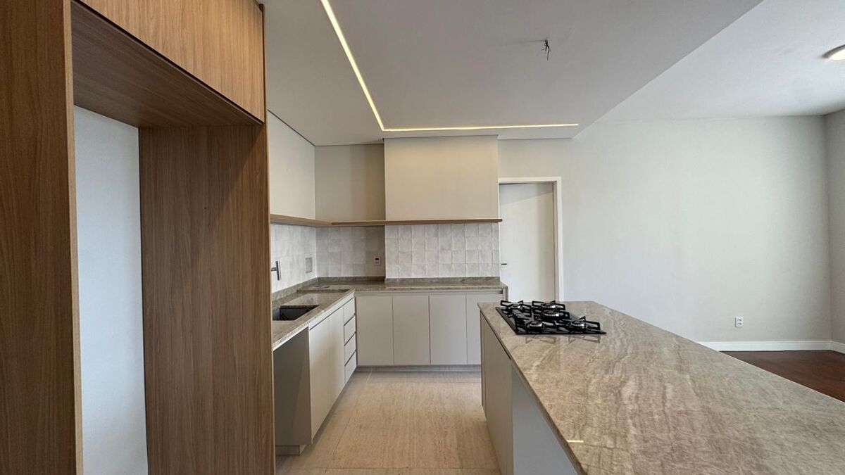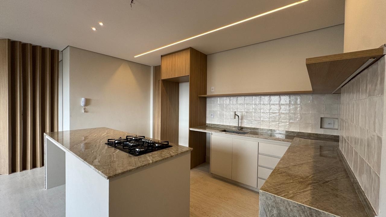 Cozinha com bancadas em Quartzito Perla Roca, com ilha para cooktop e banquetas, com marcenaria pronta. Iluminação planejada em Led (com previsão de ponto elétrico para iluminação do espelho/marcenaria).